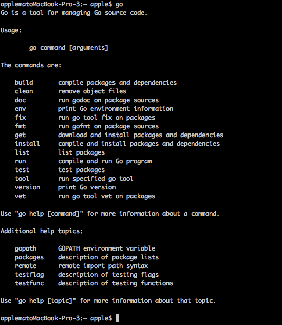 Rufe die Seite zum Herunterladen auf und wähle go1.4.2.darwin-386.pkg für 32-Bit Systeme und go1.4.2.darwin-amd64.pkg für 64-Bit Systeme. Installiere Go, indem Du immer auf "weiter" klickst. ~/go/bin wird automatisch zur Umgebungsvariable $PATH Deines Systems am Ende der Installation hinzugefügt. Öffne nun ein Terminal und tippe go ein. Du solltest die selben Ausgaben wie in Abbildung 1.1 sehen.