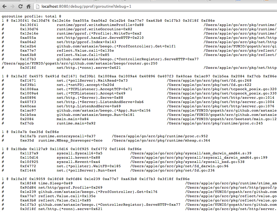 The Beego framework currently supports pprof, however it is not not turned on by default. If you need to test the performance of your application, (for instance by viewing the execution goroutine such information, in fact, Go's default package "net/http/pprof" already has this feature, and if Go manner in accordance with the default Web, you can use the default, but because beego repackaged ServHTTP function, so if you can not open the default includes this feature, so the need for internal reform beego support pprof.