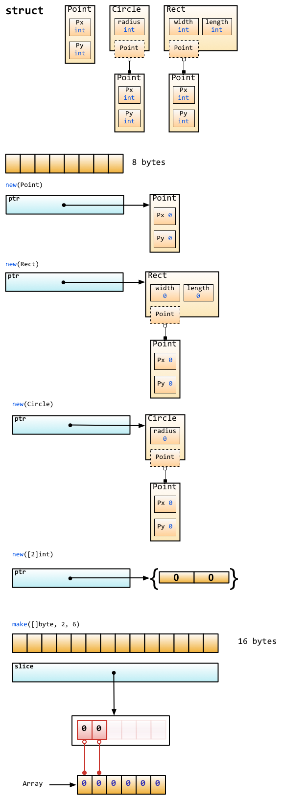 A função interna make(T, args) possui diferentes propósitos se comparado a new(T). make pode ser usado para slice, map, e channel, e retorna o tipo T com um valor inicial. A razão para fazer isto é porque os dados subjacentes destes três tipos devem ser inicializados antes de apontar para eles. Por exemplo, um slice contém um ponteiro que aponta para um array subjacente, comprimento e capacidade. Antes que estes dados sejam inicializados, slice é nil, então, para slice, map e channel, make inicializa seus dados subjacentes e atribui alguns valores adequados.
