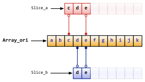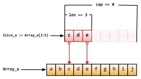 slice.Array_a := [10]byte{'a', 'b', 'c', 'd', 'e', 'f', 'g', 'h', 'i', 'j'} Slice_a := Array_a[2:5]